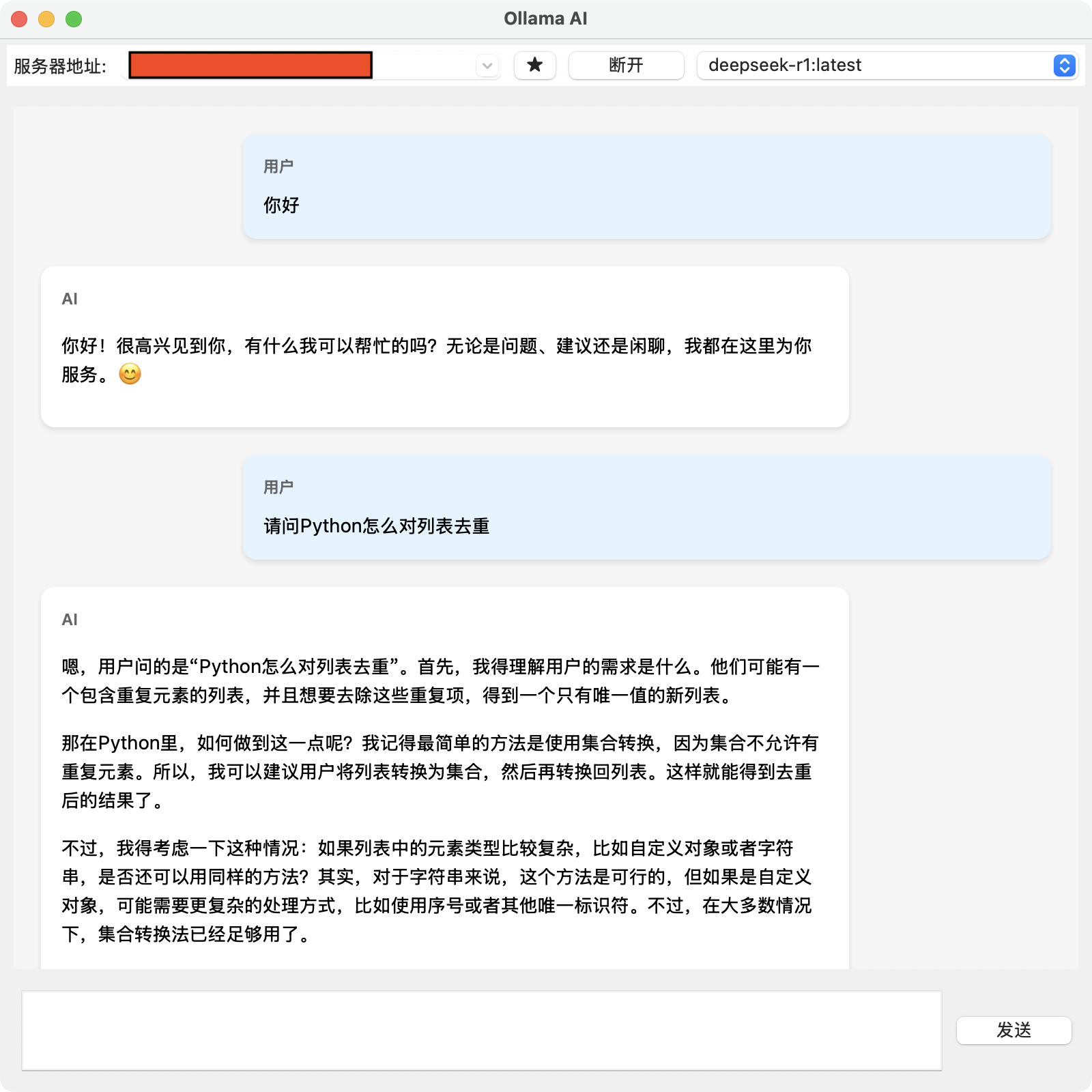 本项目使用 Python 语言基于 Ollama 服务开发,通过简单的 GUI 界面和 AI 模型对话聊天。需要自己部署 Ollama 服务(当然也可以直接在 Fofa 搜索 app="Ollama" && is_domain=false 🫣)。只需要将 IP 地址输入服务器地址栏(类似 1.1.1.1:14314),然后选择需要的模型直接对话。