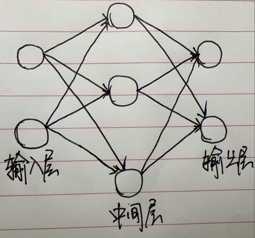 下图所示的结构就是两层神经网络,从左到右依次是输入层,中间层和输出层。中间层有时候也称为隐藏层,隐藏层的神经元是看不到的。