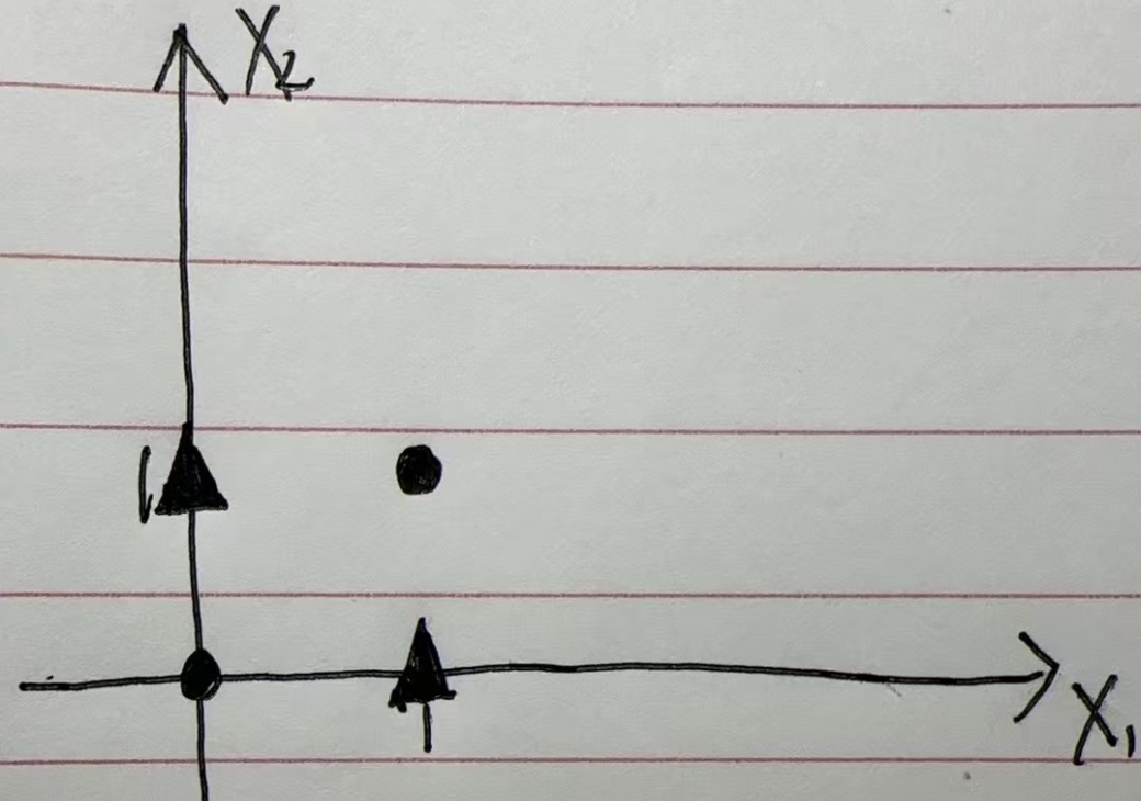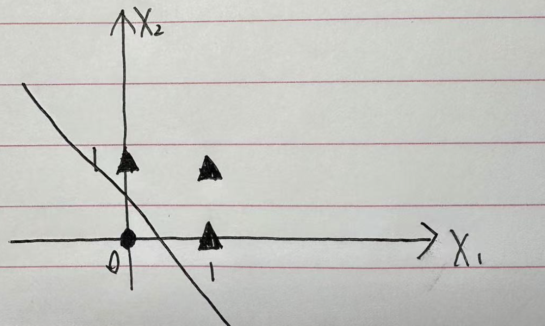 异或门在坐标系的图形则如下所示,可以看出来无法使用一条简单的直线划分。